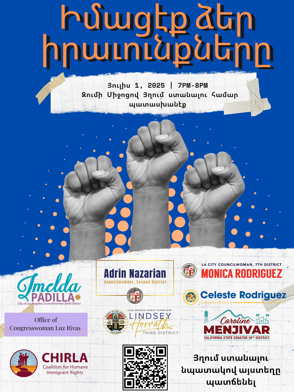 Միացէք մեր Իմանացէք Ձեր Իրաւունքները հանդիպմանը հուլիսի 1-ին, 2025-ին, ժամը 7-ից 8-ը Zoom-ով: Այս անվճար առցանց քննարկումը կօգնի ձեզ հասկանալ ձեր իրաւունքները, հարցեր տալ եւ օգտուել վստահելի ռեսուրսներից: Բաց է բոլոր Հիւսիսարեւելեան Գետի բնակիչների համար: Գրանցուէք՝ Zoom հղումը ստանալու համար: