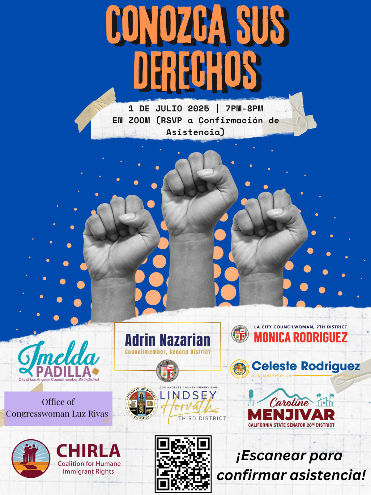 Join local leaders and community partners for a Know Your Rights Clinic on July 1, 2025, from 7PM to 8PM on Zoom. This free virtual session will help you learn about your rights, ask questions, and get connected to trusted resources. Open to all Northeast Valley residents. RSVP to receive your Zoom link!