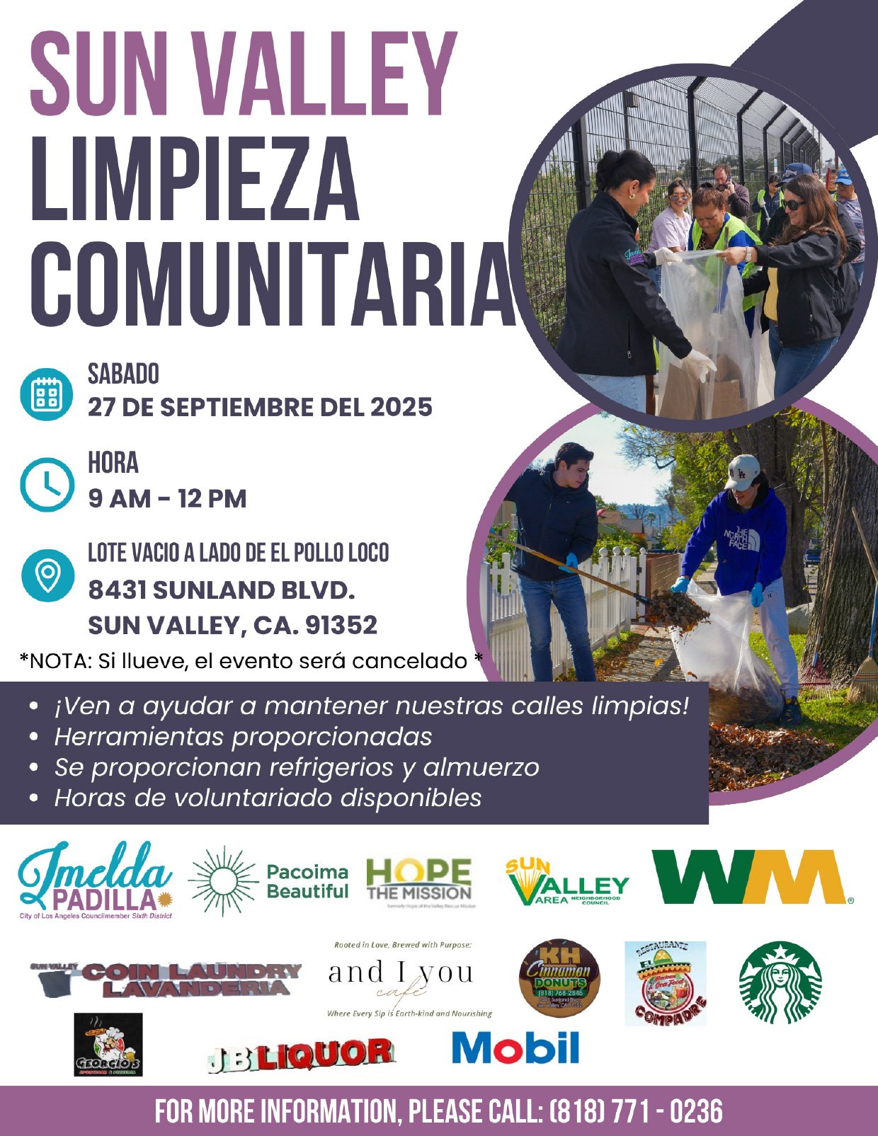 Únete a tus vecinos en la Limpieza Comunitaria de Sun Valley el sábado, 27 de septiembre de 2025, de 9 AM a 12 PM. Los voluntarios se reunirán en el lote vacío al lado de El Pollo Loco, 8431 Sunland Blvd., Sun Valley, CA 91352.