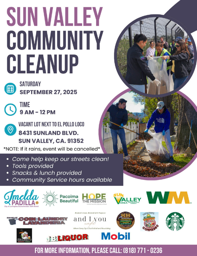 Join your neighbors for the Sun Valley Community Cleanup on Saturday, September 27, 2025, from 9 AM to 12 PM. Volunteers will meet at the vacant lot next to El Pollo Loco, 8431 Sunland Blvd., Sun Valley, CA 91352.
