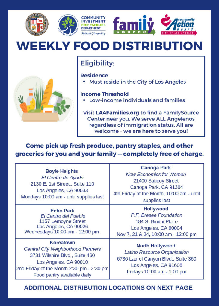 The City of Los Angeles is offering emergency financial assistance and free weekly food distribution through its FamilySource Centers. This support is available to anyone affected by delayed CalFresh benefits or other financial challenges.