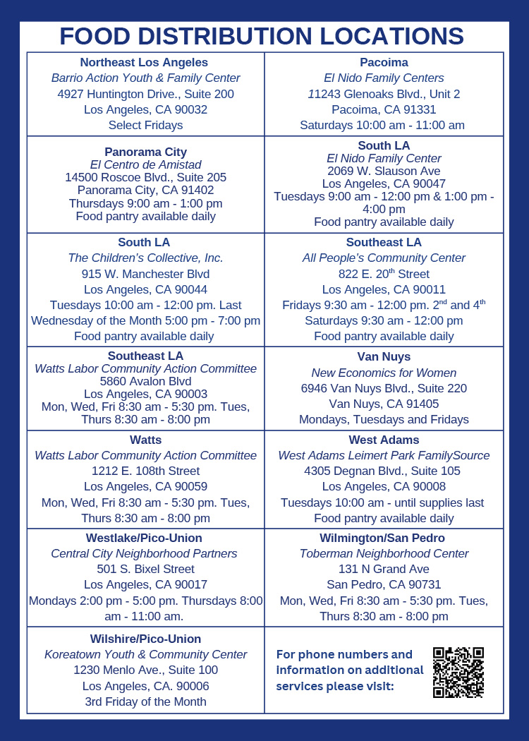 Fresh produce, pantry staples, and household groceries are available at locations across Los Angeles. Walk-ins are welcome. Food is given out while supplies last.