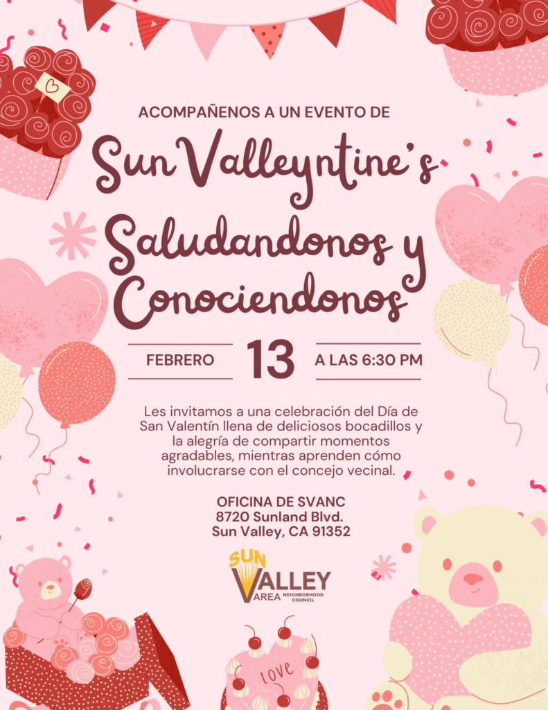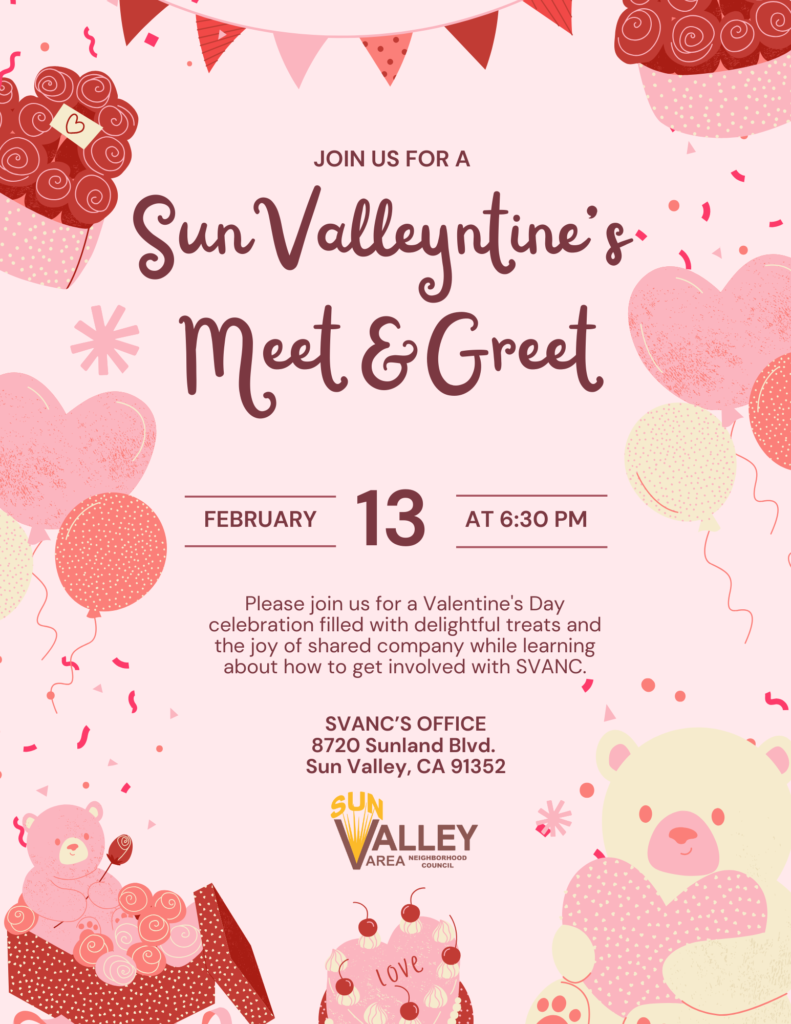 Join the Sun Valley Area Neighborhood Council for a Valentine’s-themed meet and greet focused on community connection and civic engagement. Residents are invited to enjoy light refreshments, meet board members, and learn how to get involved with SVANC in a welcoming, informal setting.